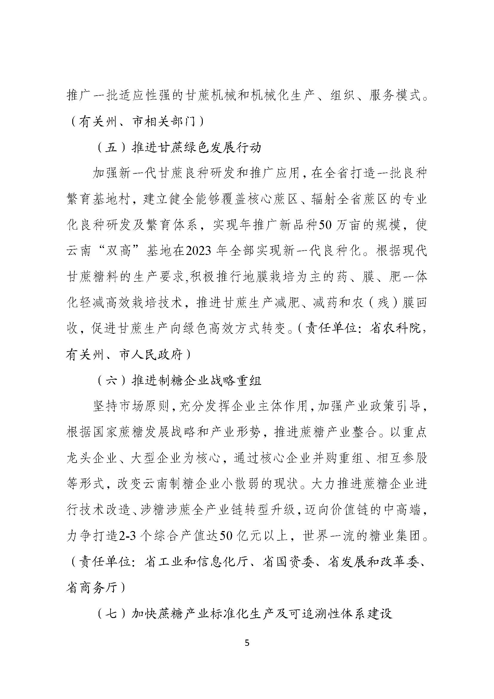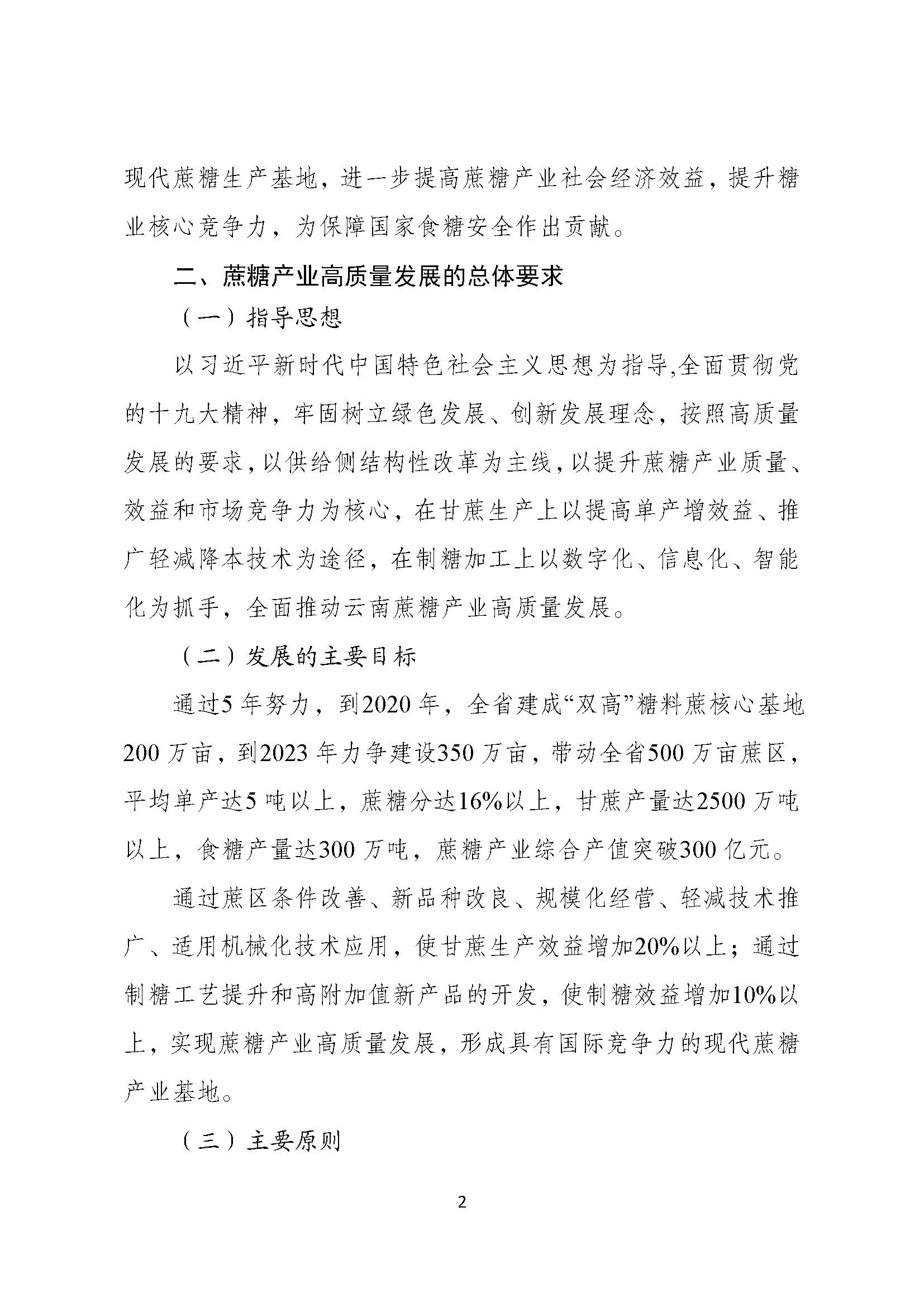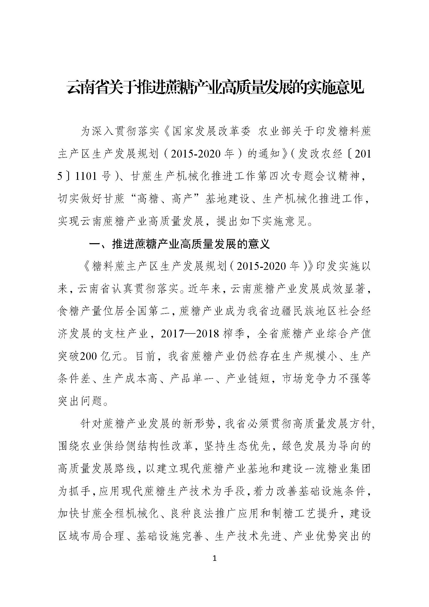 近日,《云南省关于推进蔗糖产业高质量发展的实施意见》(以下称简称《意见》)出炉。《意见》提出,通过5年努力,到2023年,全省力争建设“双高”糖料蔗核心基地达350万亩,带动全省500万亩蔗区平均单产达5吨以上,蔗糖分达16%以上,甘蔗产量达2500万吨以上,食糖产量达300万吨,蔗糖产业综合产值突破300亿元。 《意见》全文如下: