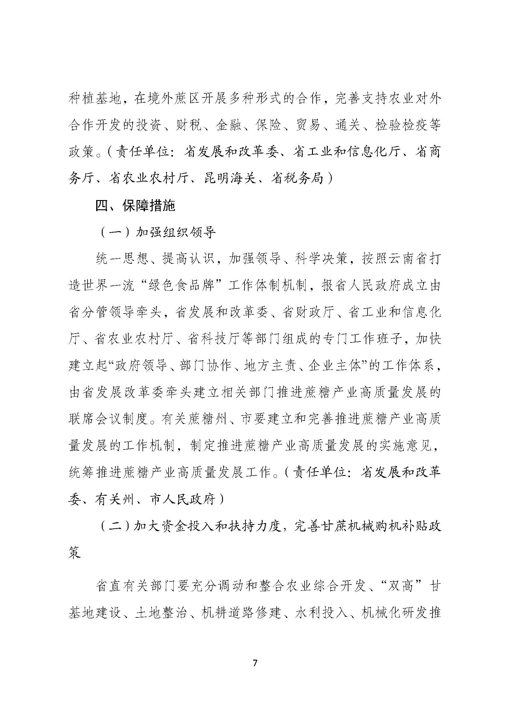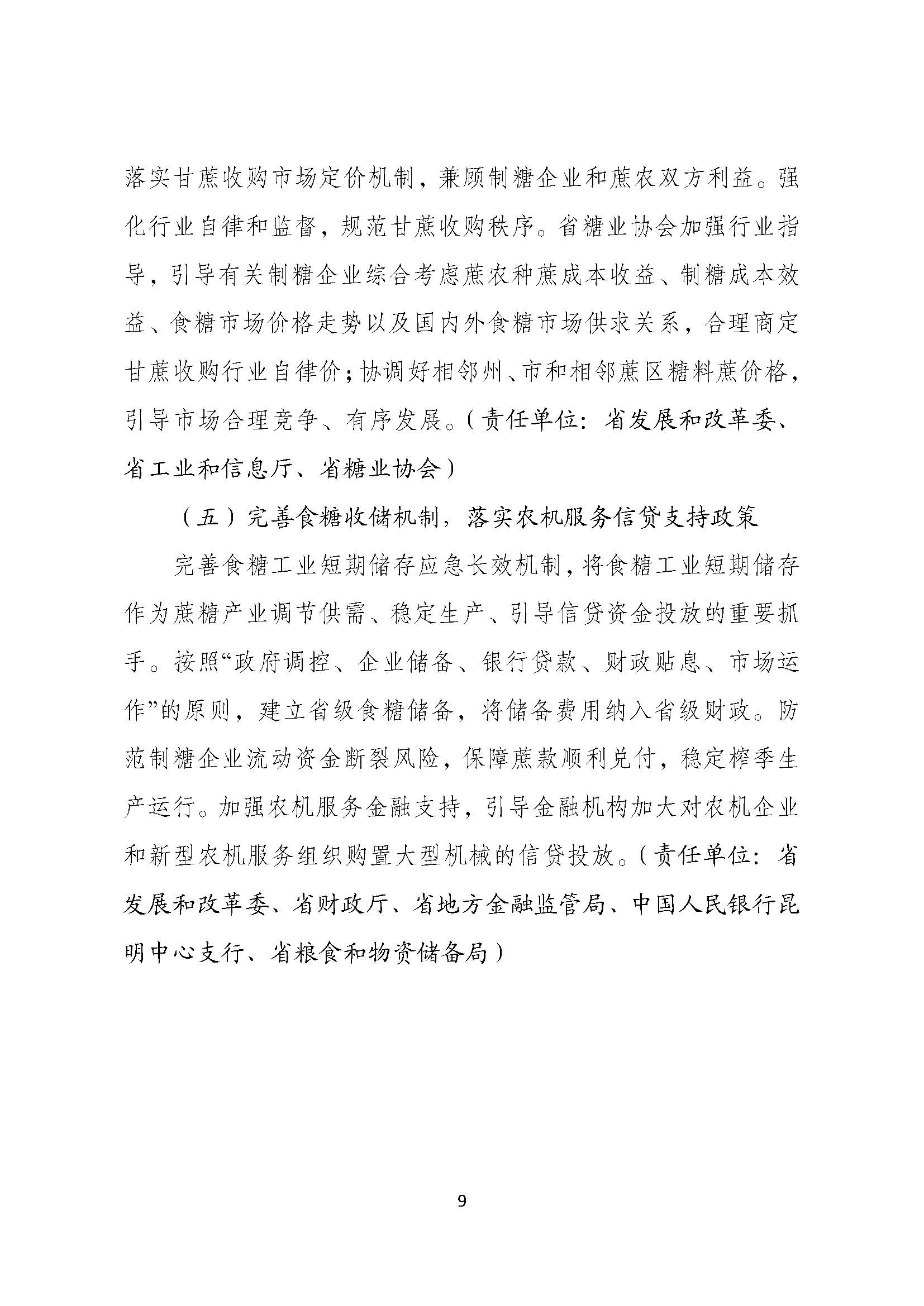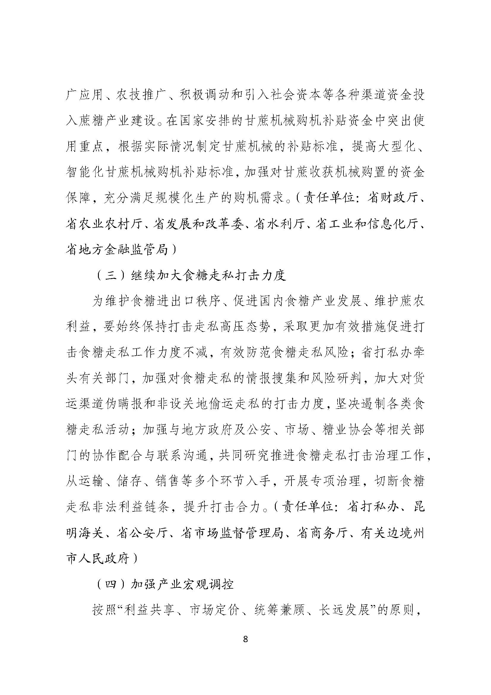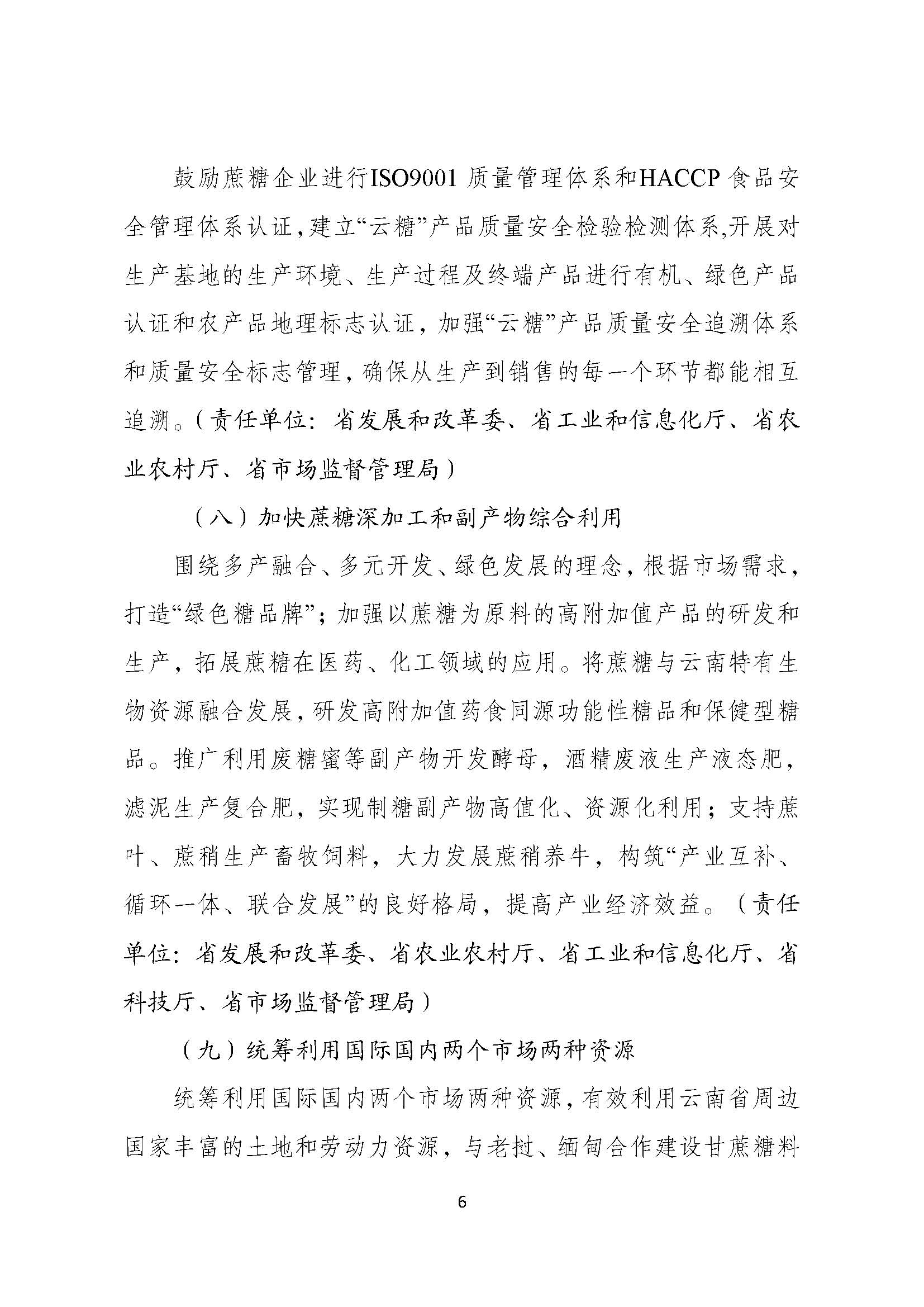 近日,《云南省关于推进蔗糖产业高质量发展的实施意见》(以下称简称《意见》)出炉。《意见》提出,通过5年努力,到2023年,全省力争建设“双高”糖料蔗核心基地达350万亩,带动全省500万亩蔗区平均单产达5吨以上,蔗糖分达16%以上,甘蔗产量达2500万吨以上,食糖产量达300万吨,蔗糖产业综合产值突破300亿元。 《意见》全文如下: